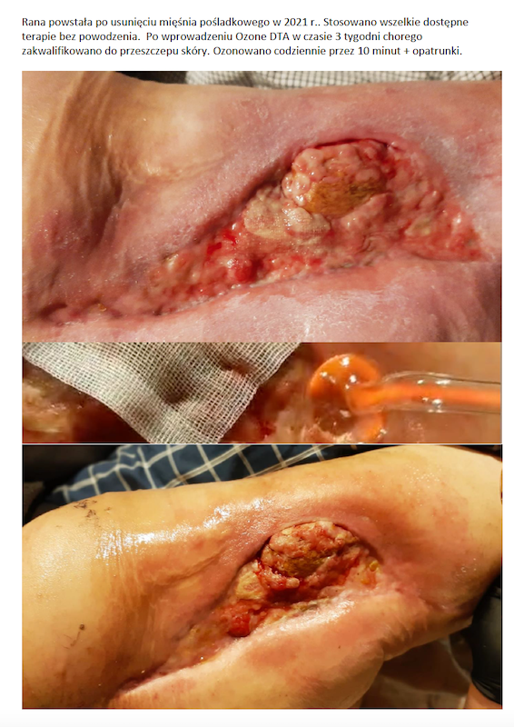 Rana powstała po usunięciu mięśnia pośladkowego w 2021 r.. Stosowano wszelkie dostępne terapie bez powodzenia. Po wprowadzeniu Ozone DTA w czasie 3 tygodni chorego zakwalifikowano do przeszczepu skóry. Ozonowano codziennie przez 10 minut + opatrunki.